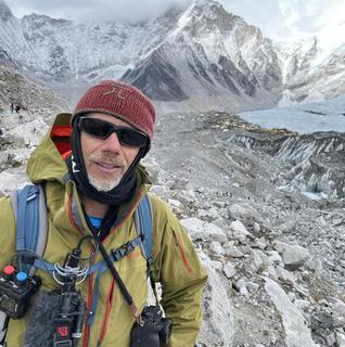 (photos this page: Interviewing Erik Weihenmayer in the Grand Canyon, 2014; At Everest Base Camp May 2025, for 60 Minutes., Drew with Donald Duck, Anaheim, 1973 Photos on HOME page: Another bad hair day in Ghana Africa, With Bill Whitaker for 60 Minutes -Mar 2024, Working at a "Death to America" rally in Tehran, Iran.